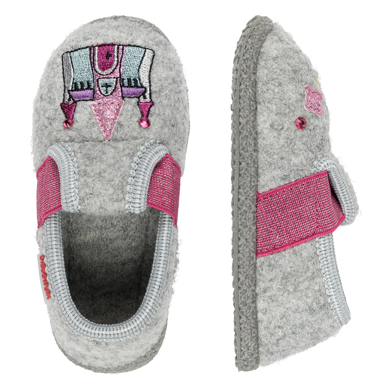These princess shoes will make children's hearts beat faster! The lovely design, with enchanting princess and castle appliqués, and the high level of comfort will win over even the most demanding little adventurers. The woollen slippers ensure that children's little feet always stay nice and warm. The elasticated side band helps little princesses to put the slippers on and take them off on their own. The non-slip rubber sole supports the children and guarantees a good grip.
